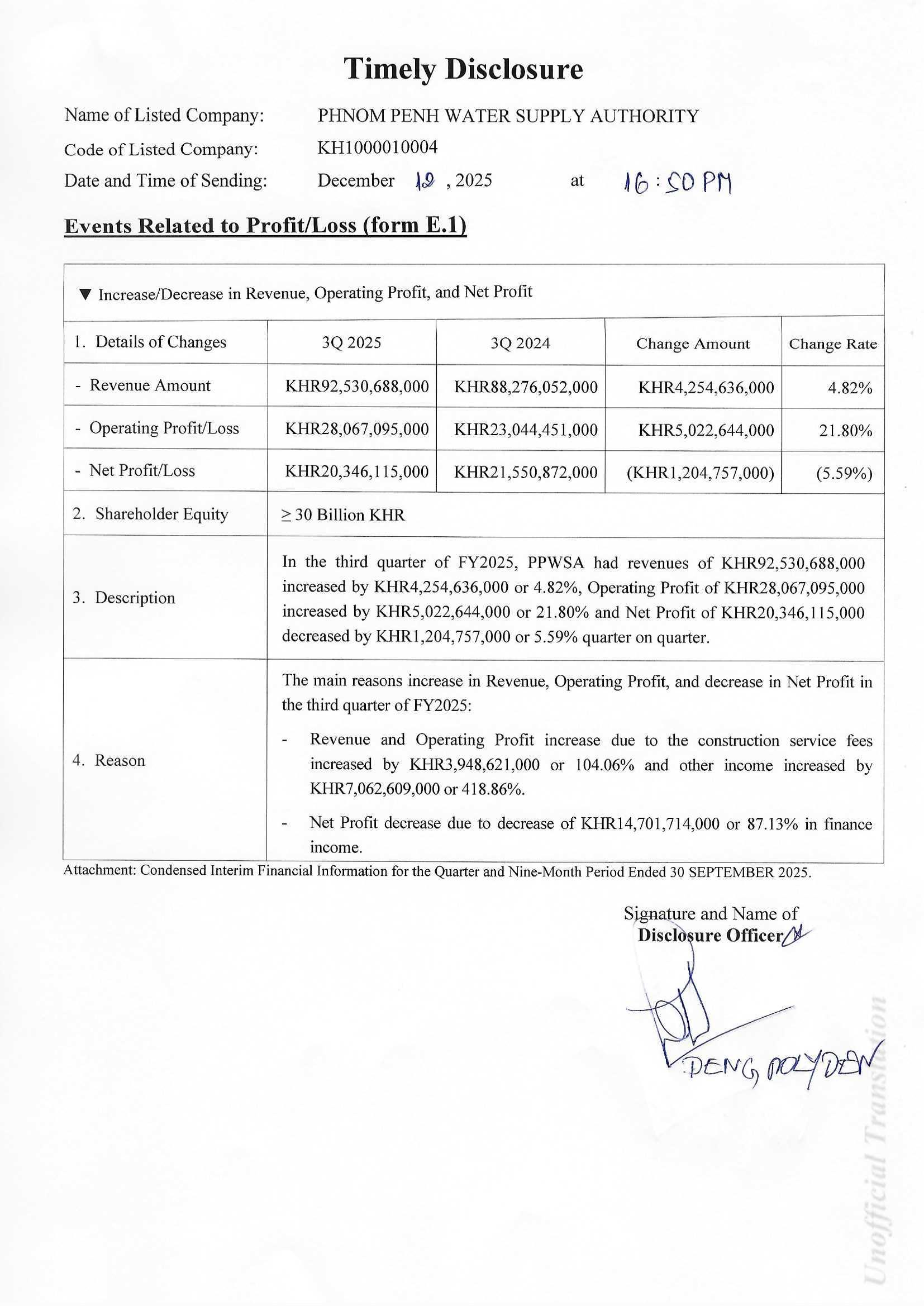 In the third quarter of FY2025, PPWSA had revenues of KHR92,530,688,000 increased by KHR4,254,636,000 or 4.82%, Operating Profit of KHR28,067,095,000 increased by KHR5,022,644,000 or 21.80% and Net Profit of KHR20,346,115,000 decreased by KHR1,204,757,000 or 5.59% quarter on quarter.
