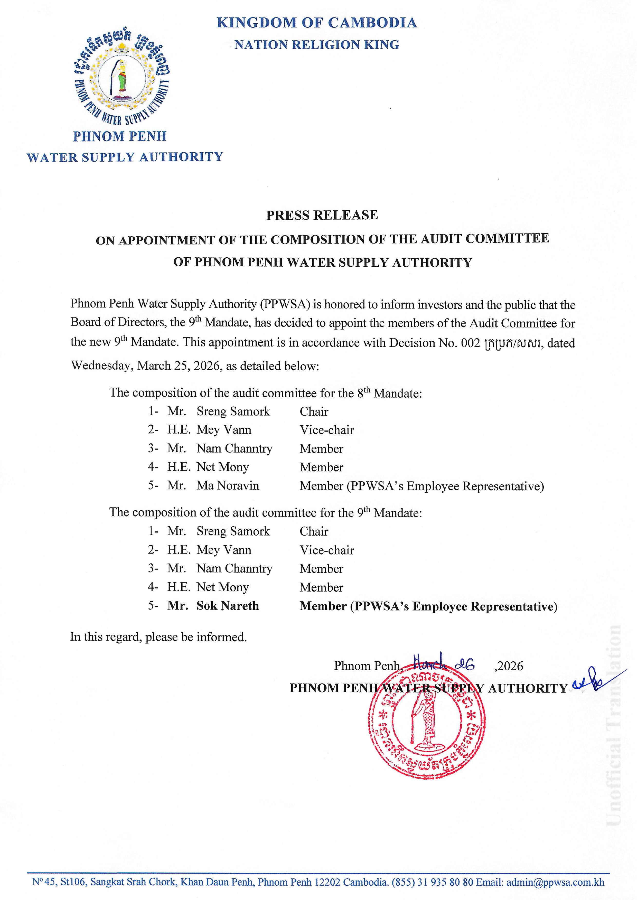 Press Release on Appointment of The Composition of The Audit Committee of Phnom Penh Water Supply Authority (Unofficial Translation)