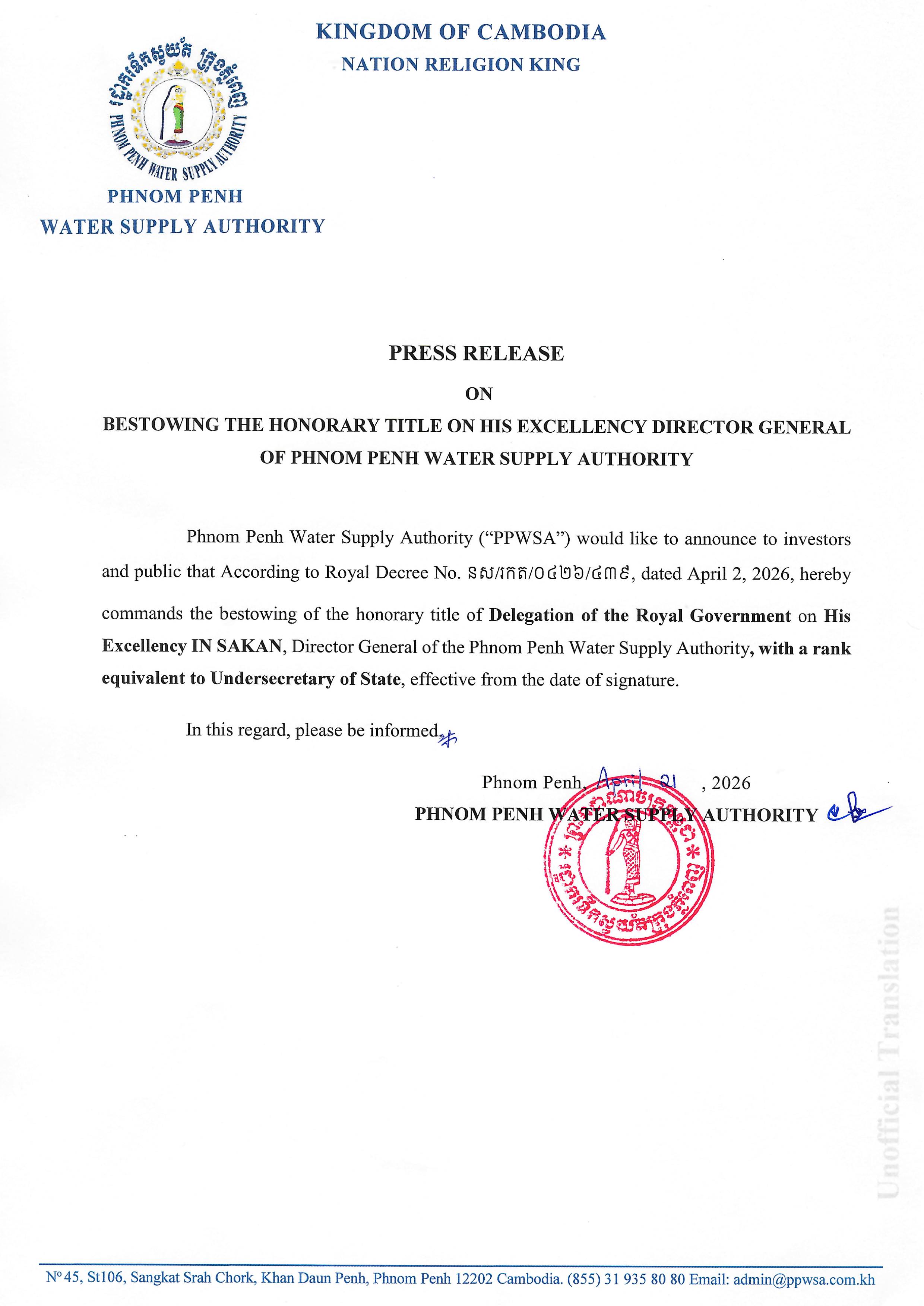 Phnom Penh Water Supply Authority (“PPWSA”) would like to announce to investors and public that According to Royal Decree No. នស/រកត/០៤២៦/៤៣៩, dated April 2, 2026, hereby commands the bestowing of the honorary title of Delegation of the Royal Government on His Excellency IN SAKAN, Director General of the Phnom Penh Water Supply Authority, with a rank equivalent to Undersecretary of State, effective from the date of signature.