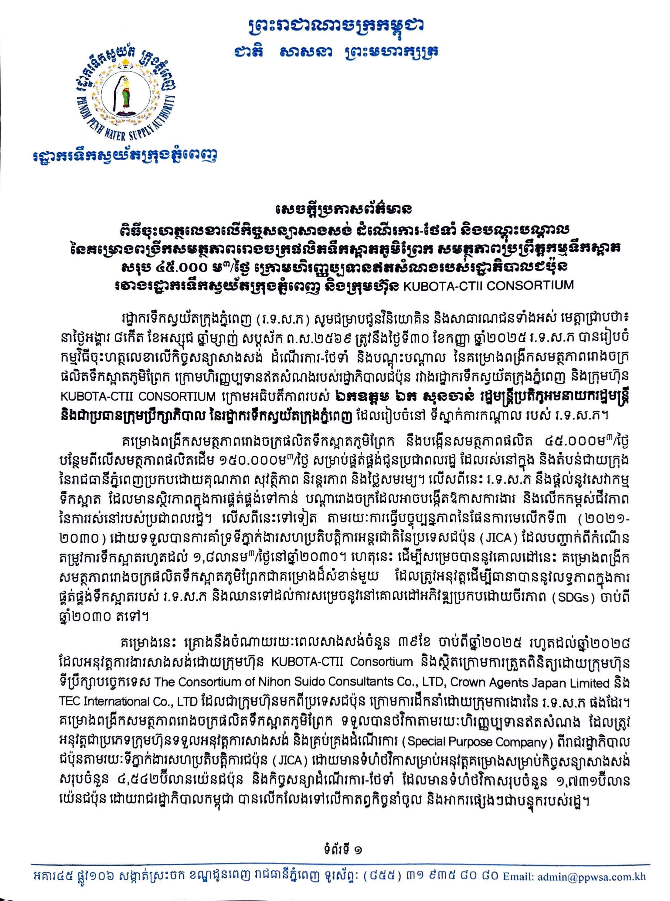 សេចក្តីប្រកាសព័ត៌មានស្តីពី ពិធីចុះហត្ថលេខាលើកិច្ចសន្យាសាងសង់ ដំណើរការ-ថែទាំ និងបណ្តុះបណ្តាលនៃគម្រោងពង្រីកសមត្ថភាពរោងចក្រផលិតទឹកស្អាតភូមិព្រែក សមត្ថភាពប្រព្រឹត្តកម្មទឹកស្អាតសរុប ៤៥.០០០ ម៣/ថ្ងៃ ក្រោមហិរញ្ញប្បទានឥតសំណងរបស់រដ្ឋាភិបាលជប៉ុន រវាងរដ្ឋាករទឹកស្វយ័តក្រុងភ្នំពេញ និងក្រុមហ៊ុន KUBOTA-CTII CONSORTIUM