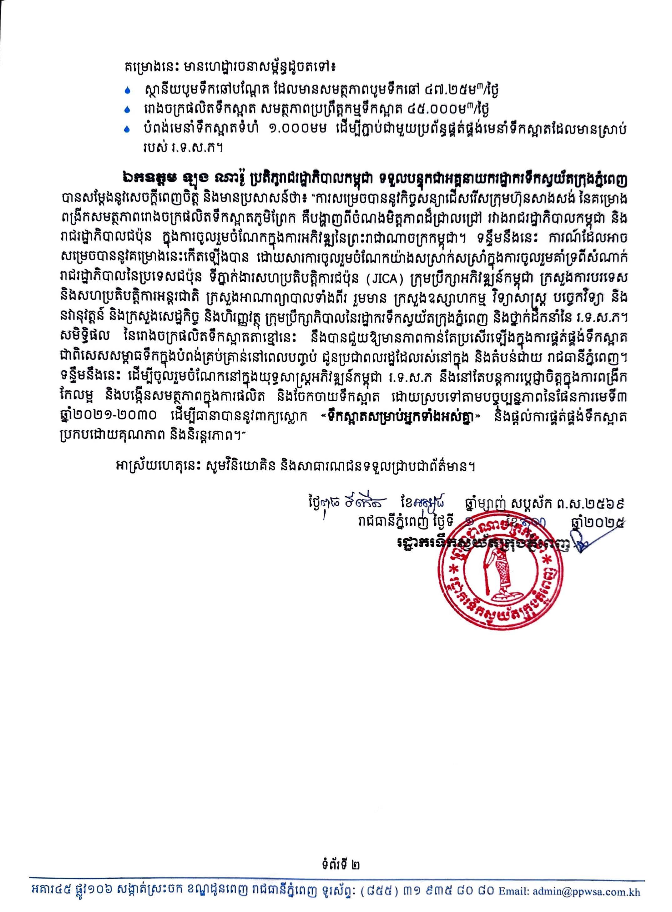 រដ្ឋាករទឹកស្វយ័តក្រុងភ្នំពេញ (រ.ទ.ស.ភ) សូមជម្រាបជូនវិនិយោគិន និងសាធារណជនទាំងអស់ មេត្តាជ្រាបថា៖ នាថ្ងៃអង្គារ ៨កើត ខែអស្សុជ ឆ្នាំម្សាញ់ សប្តស័ក ព.ស.២៥៦៩ ត្រូវនឹងថ្ងៃទី៣០ ខែកញ្ញា ឆ្នាំ២០២៥ រ.ទ.ស.ភ បានរៀបចំកម្មវិធីចុះហត្ថលេខាលើកិច្ចសន្យាសាងសង់ ដំណើរការ-ថែទាំ និងបណ្តុះបណ្តាល នៃគម្រោងពង្រីកសមត្ថភាពរោងចក្រផលិតទឹកស្អាតភូមិព្រែក ក្រោមហិរញ្ញប្បទានឥតសំណងរបស់រដ្ឋាភិបាលជប៉ុន រវាងរដ្ឋាករទឹកស្វយ័តក្រុងភ្នំពេញ និងក្រុមហ៊ុន KUBOTA-CTII CONSORTIUM ក្រោមអធិបតីភាពរបស់ ឯកឧត្តម ឯក សុនចាន់ រដ្ឋមន្រ្តីប្រតិភូអមនាយករដ្ឋមន្ត្រី និងជាប្រធានក្រុមប្រឹក្សាភិបាល នៃរដ្ឋាករទឹកស្វយ័តក្រុងភ្នំពេញ ដែលរៀបចំនៅ ទីស្នាក់ការកណ្តាលរបស់ រ.ទ.ស.ភ។