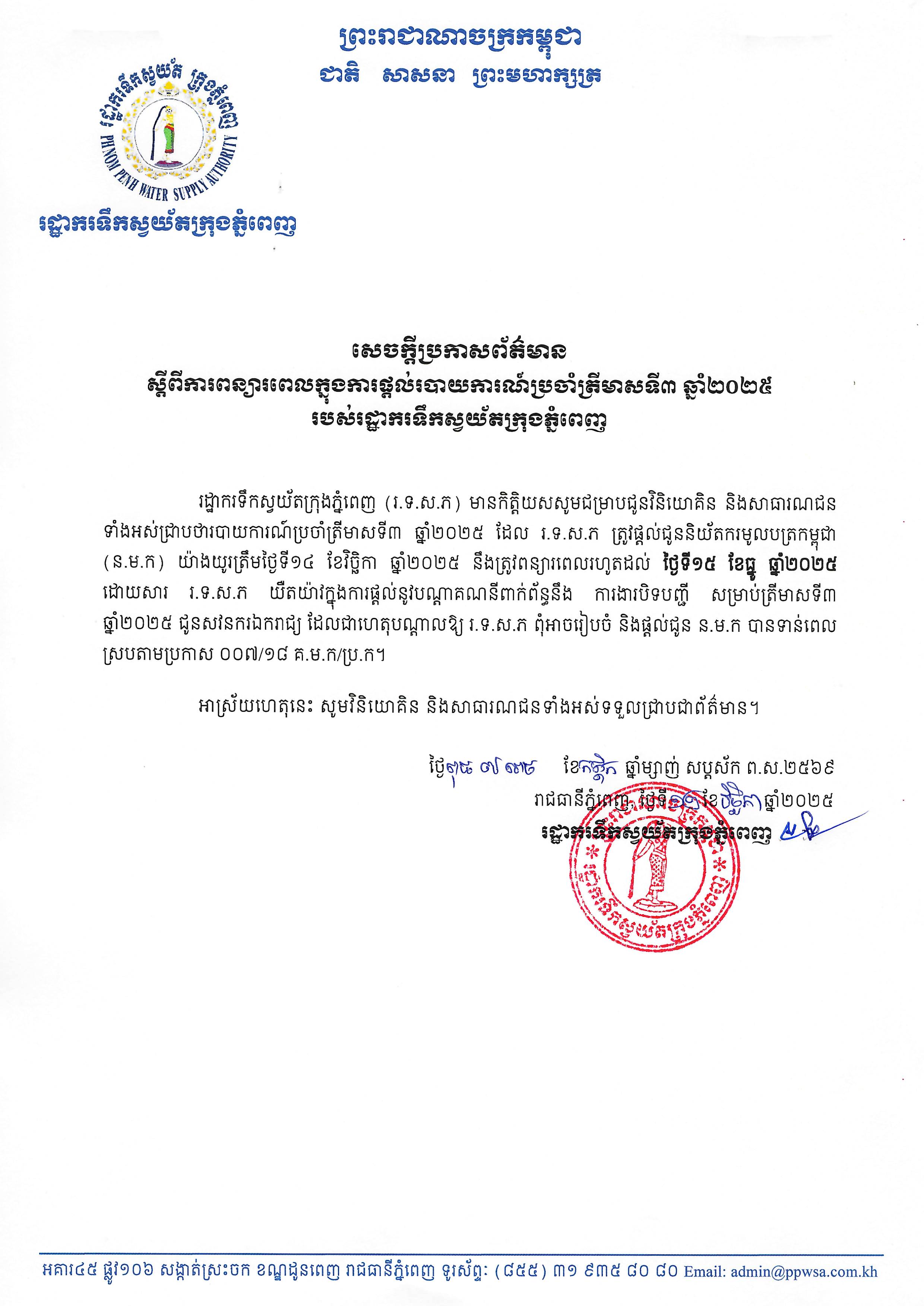 រដ្ឋាករទឹកស្វយ័តក្រុងភ្នំពេញ (រ.ទ.ស.ភ) មានកិត្តិយសសូមជម្រាបជូនវិនិយោគិន និងសាធារណជន ទាំងអស់ជ្រាបថារបាយការណ៍ប្រចាំត្រីមាសទី៣ ឆ្នាំ២០២៥ ដែល រ.ទ.ស.ភ ត្រូវផ្តល់ជូននិយ័តករមូលបត្រកម្ពុជា (ន.ម.ក) យ៉ាងយូរត្រឹមថ្ងៃទី១៤ ខែវិច្ឆិកា ឆ្នាំ២០២៥ នឹងត្រូវពន្យារពេលរហូតដល់ ថ្ងៃទី១៥ ខែធ្នូ ឆ្នាំ២០២៥ ដោយសារ រ.ទ.ស.ភ យឺតយ៉ាវក្នុងការផ្តល់នូវបណ្តាគណនីពាក់ព័ន្ធនឹង ការងារបិទបញ្ជី សម្រាប់ត្រីមាសទី៣ ឆ្នាំ២០២៥ ជូនសវនករឯករាជ្យ ដែលជាហេតុបណ្តាលឱ្យ រ.ទ.ស.ភ ពុំអាចរៀបចំ និងផ្តល់ជូន ន.ម.ក បានទាន់ពេល ស្របតាមប្រកាស ០០៧/១៨ គ.ម.ក/ប្រ.ក។