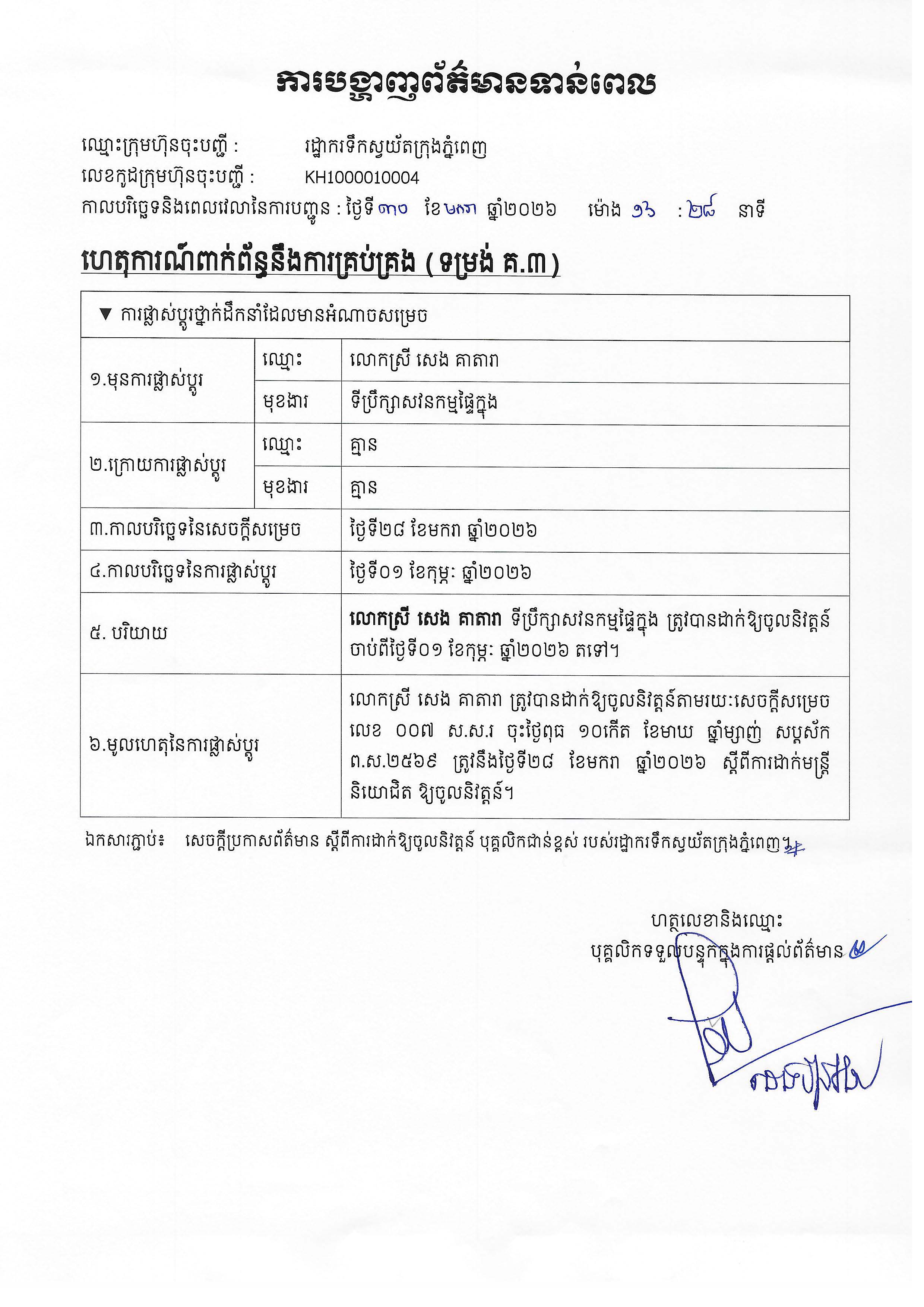 សេចក្តីប្រកាសព័ត៌មានស្តីពី ការដាក់ឱ្យចូលនិវត្តន៍ បុគ្គលិកជាន់ខ្ពស់ របស់រដ្ឋាករទឹកស្វយ័តក្រុងភ្នំពេញ