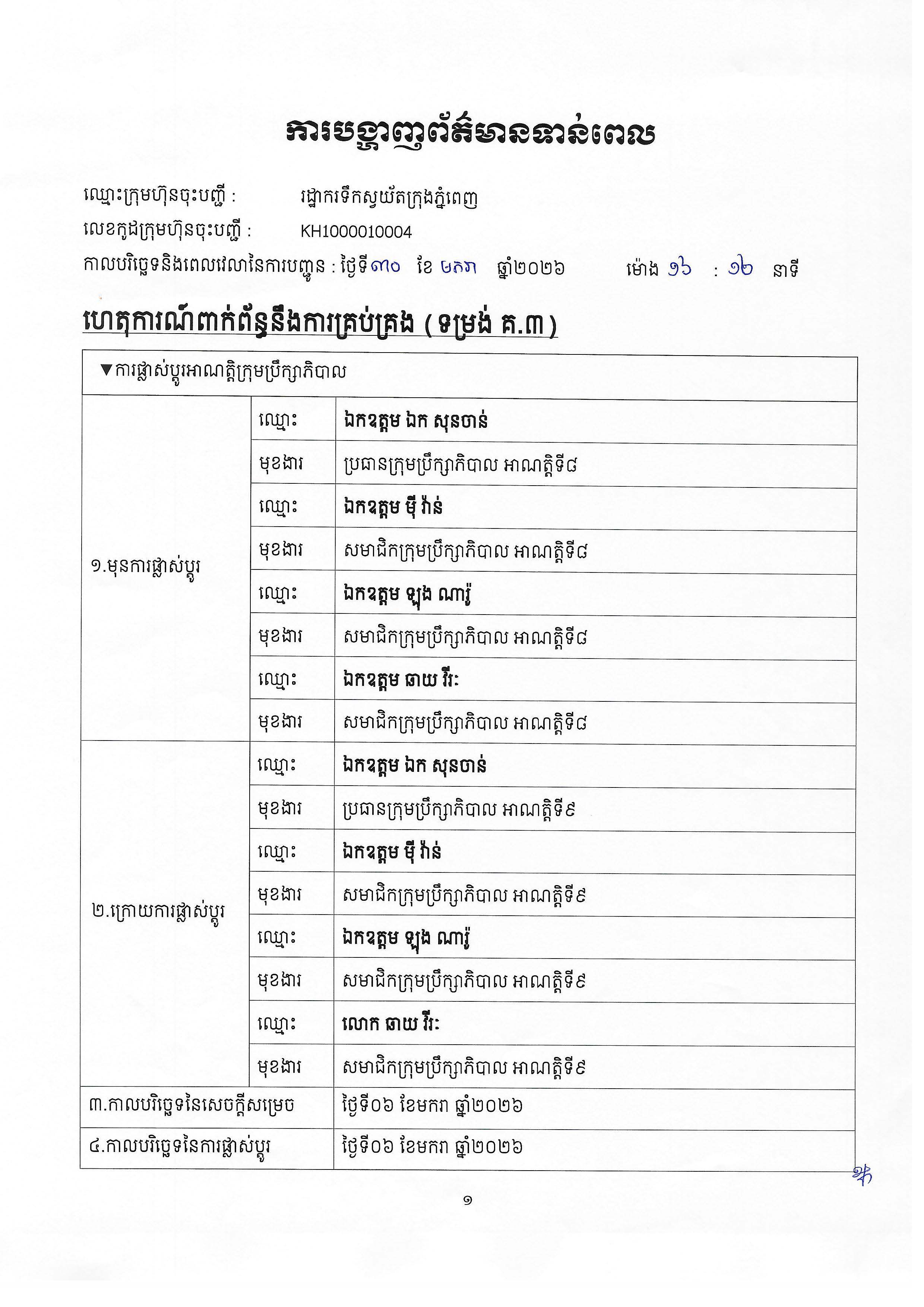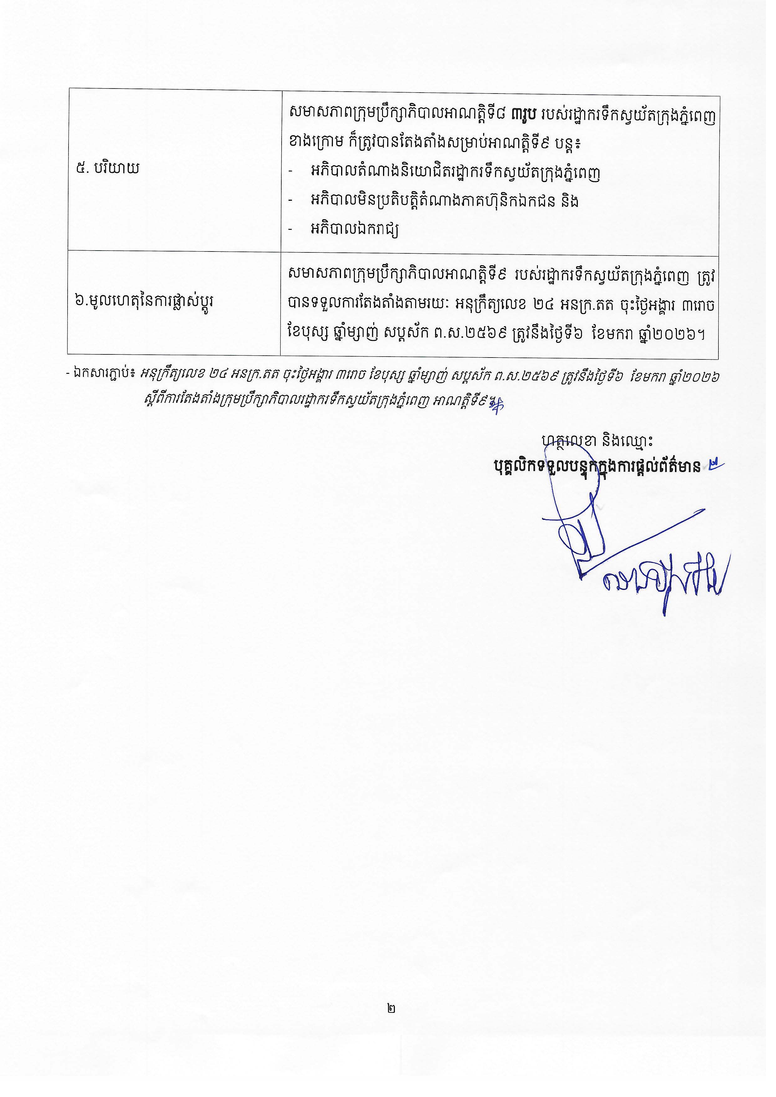 សមាសភាពក្រុមប្រឹក្សាភិបាលអាណត្តិទី៨ របស់រដ្ឋាករទឹកស្វយ័តក្រុងភ្នំពេញ ត្រូវបានតែងតាំងសម្រាប់អាណត្តិទី៩ បន្ត តាមរយៈអនុក្រឹត្យលេខ ២៤ អនក្រ.តត ចុះថ្ងៃអង្គារ ៣រោច ខែបុស្ស ឆ្នាំម្សាញ់ សប្តស័ក ព.ស.២៥៦៩ ត្រូវនឹងថ្ងៃទី៦ ខែមករា ឆ្នាំ២០២៦។
