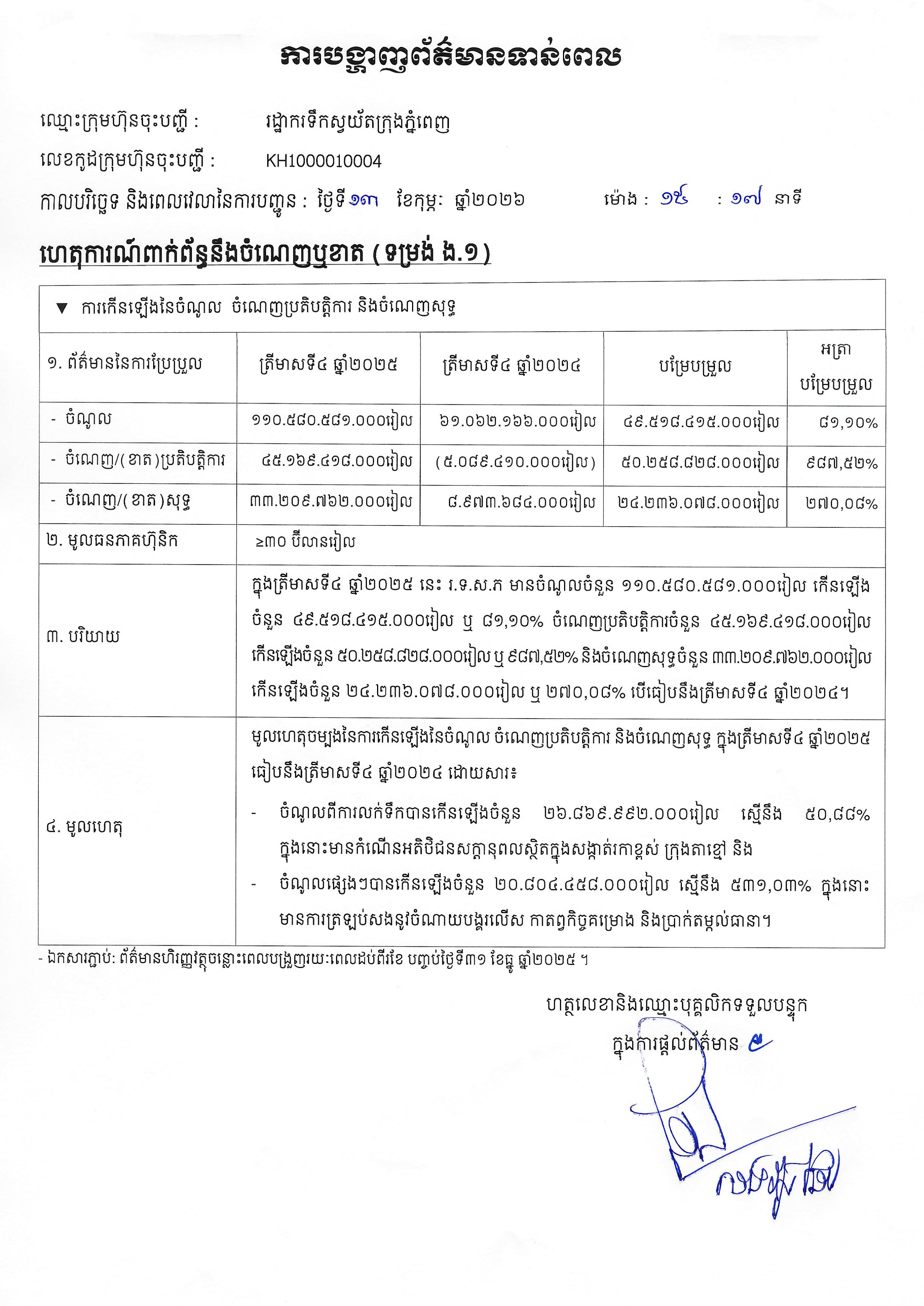ក្នុងត្រីមាសទី៤ ឆ្នាំ២០២៥ នេះ រ.ទ.ស.ភ មានចំណូលចំនួន ១១០.៥៨០.៥៨១.០០០រៀល កើនឡើងចំនួន ៤៩.៥១៨.៤១៥.០០០រៀល ឬ ៨១,១០% ចំណេញប្រតិបត្តិការចំនួន ៤៥.១៦៩.៤១៨.០០០រៀល កើនឡើងចំនួន ៥០.២៥៨.៨២៨.០០០រៀល ឬ ៩៨៧,៥២% និងចំណេញសុទ្ធចំនួន ៣៣.២០៩.៧៦២.០០០រៀល កើនឡើងចំនួន ២៤.២៣៦.០៧៨.០០០រៀល ឬ២៧០,០៨% បើធៀបនឹងត្រីមាសទី៤ ឆ្នាំ២០២៤។