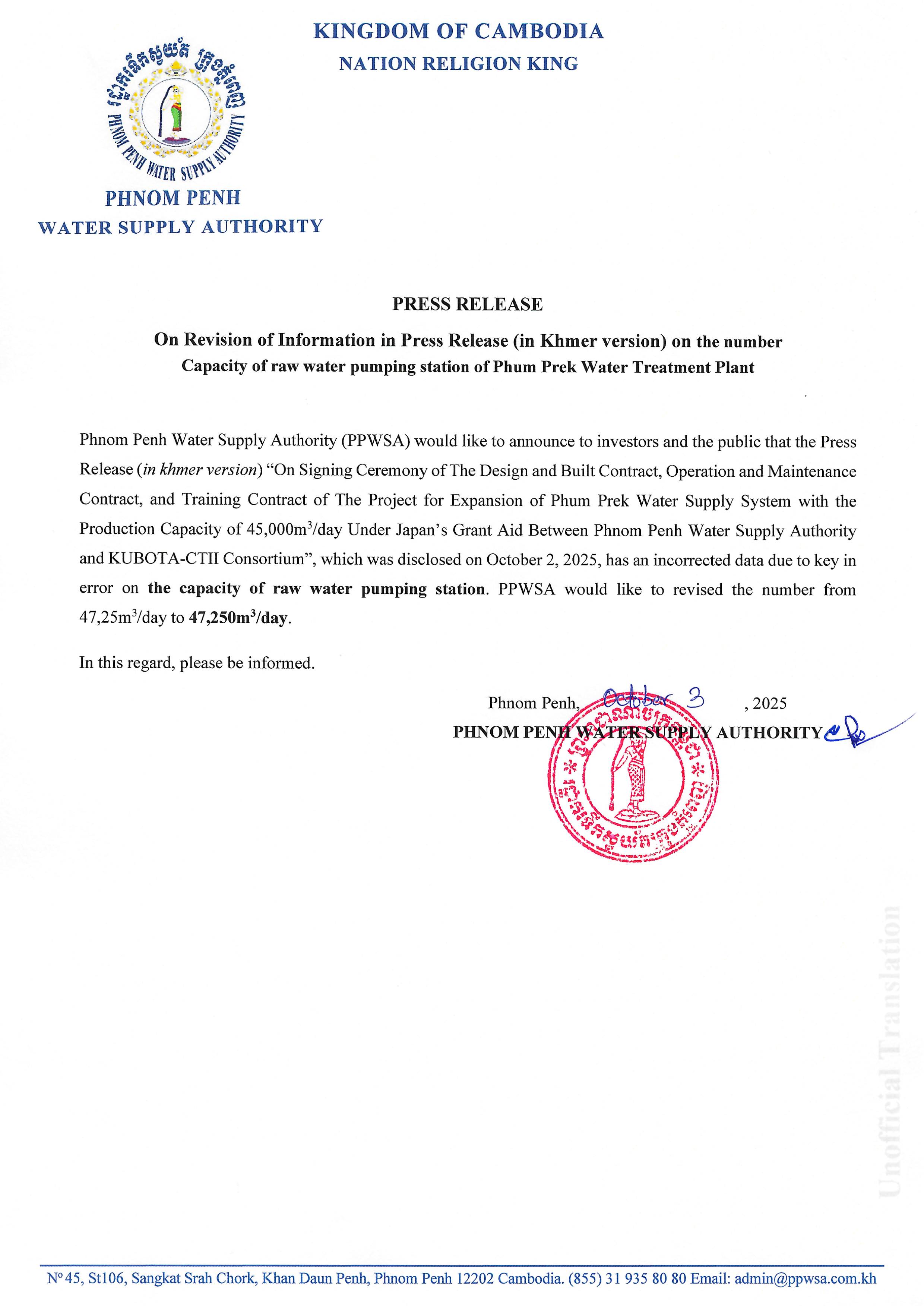 Phnom Penh Water Supply Authority (PPWSA) would like to investors and the public that the Press Release (in khmer version) “On Signing Ceremony of The Design and Built Contract, Operation and Maintenance Contract, and Training Contract of The Project for Expansion of Phum Prek Water Supply System with the Production Capacity of 45,000m3/day Under Japan’s Grant Aid Between Phnom Penh Water Supply Authority and KUBOTA-CTII Consortium”, which was disclosed on October 2, 2025, has an incorrected data due to key in error on the capacity of raw water pumping station. PPWSA would like to revised the number from 47,25m3/day to 47,250m3/day, as detailed in the Press Release.