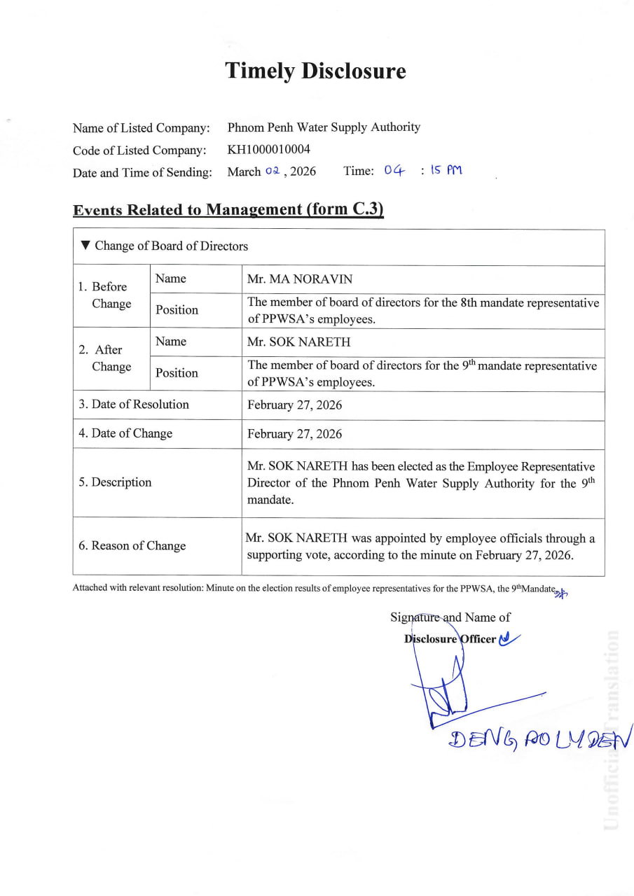 Mr. SOK NARETH has been elected as the Employee Representative Director of the Phnom Penh Water Supply Authority for the 9th mandate, through a supporting vote, according to the minute on February 27, 2026.