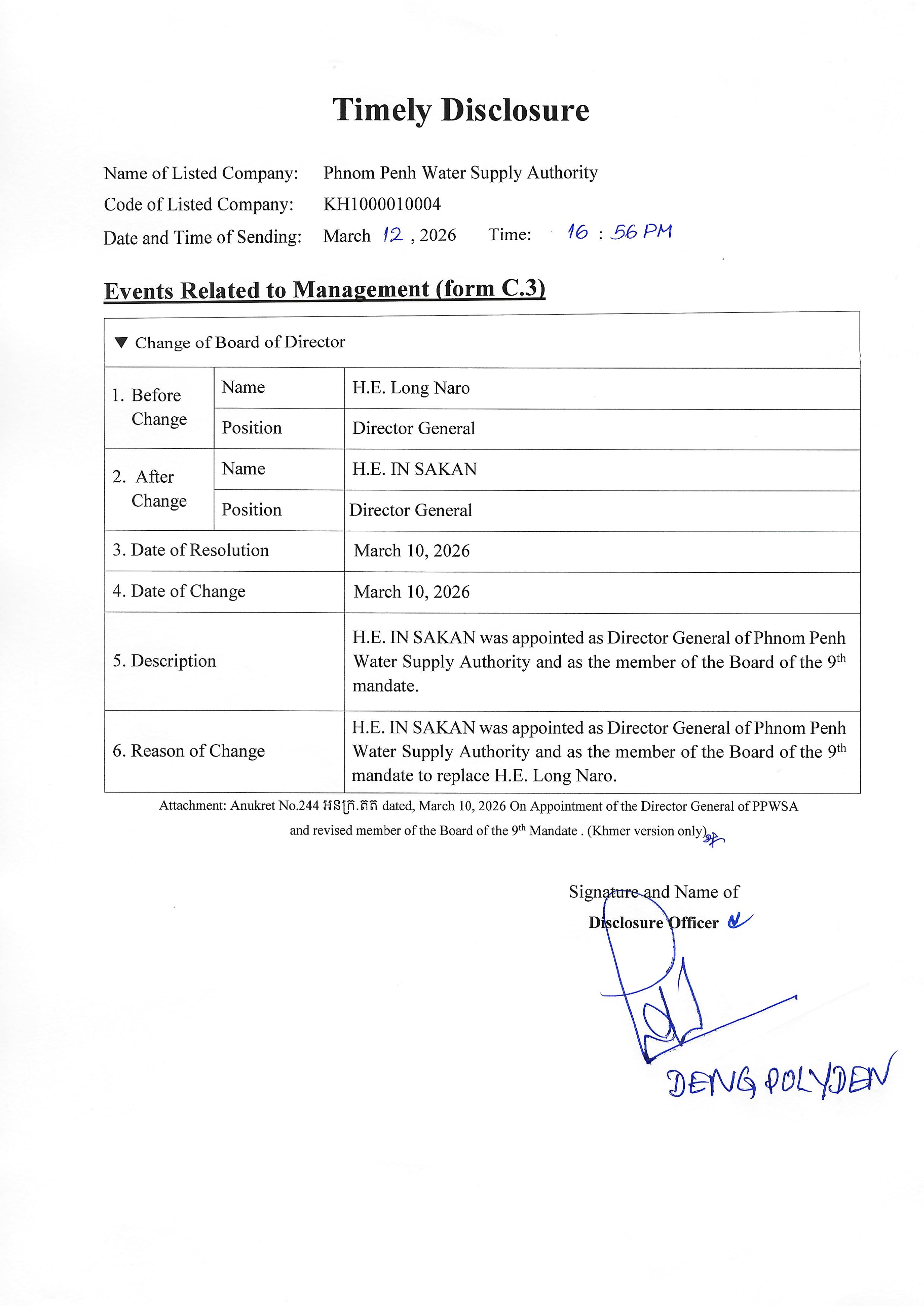H.E. In Sakan was appointed as Director General of Phnom Penh Water Supply Authority and as the member of the Board of the 9th mandate to replace H.E. Long Naro as Anukret No.244 អនក្រ.តត dated, March 10, 2026.