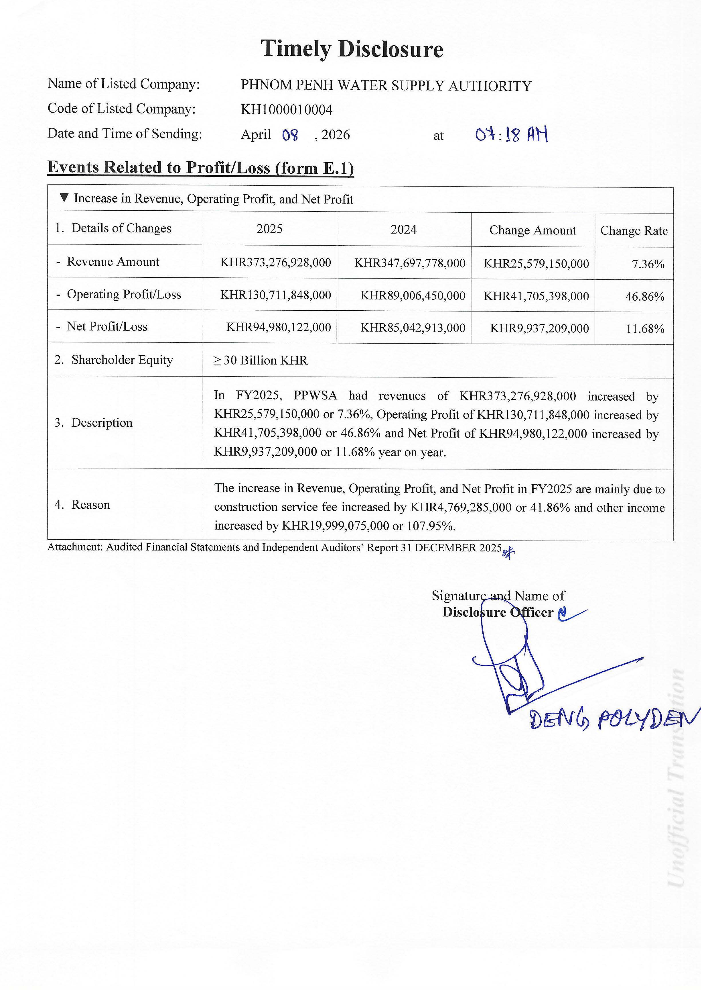 In FY2025, PPWSA had revenues of KHR373,276,928,000 increased by KHR25,579,150,000 or 7.36%, Operating Profit of KHR130,711,848,000 increased by KHR41,705,398,000 or 46.86% and Net Profit of KHR94,980,122,000 increased by KHR9,937,209,000 or 11.68% year on year.