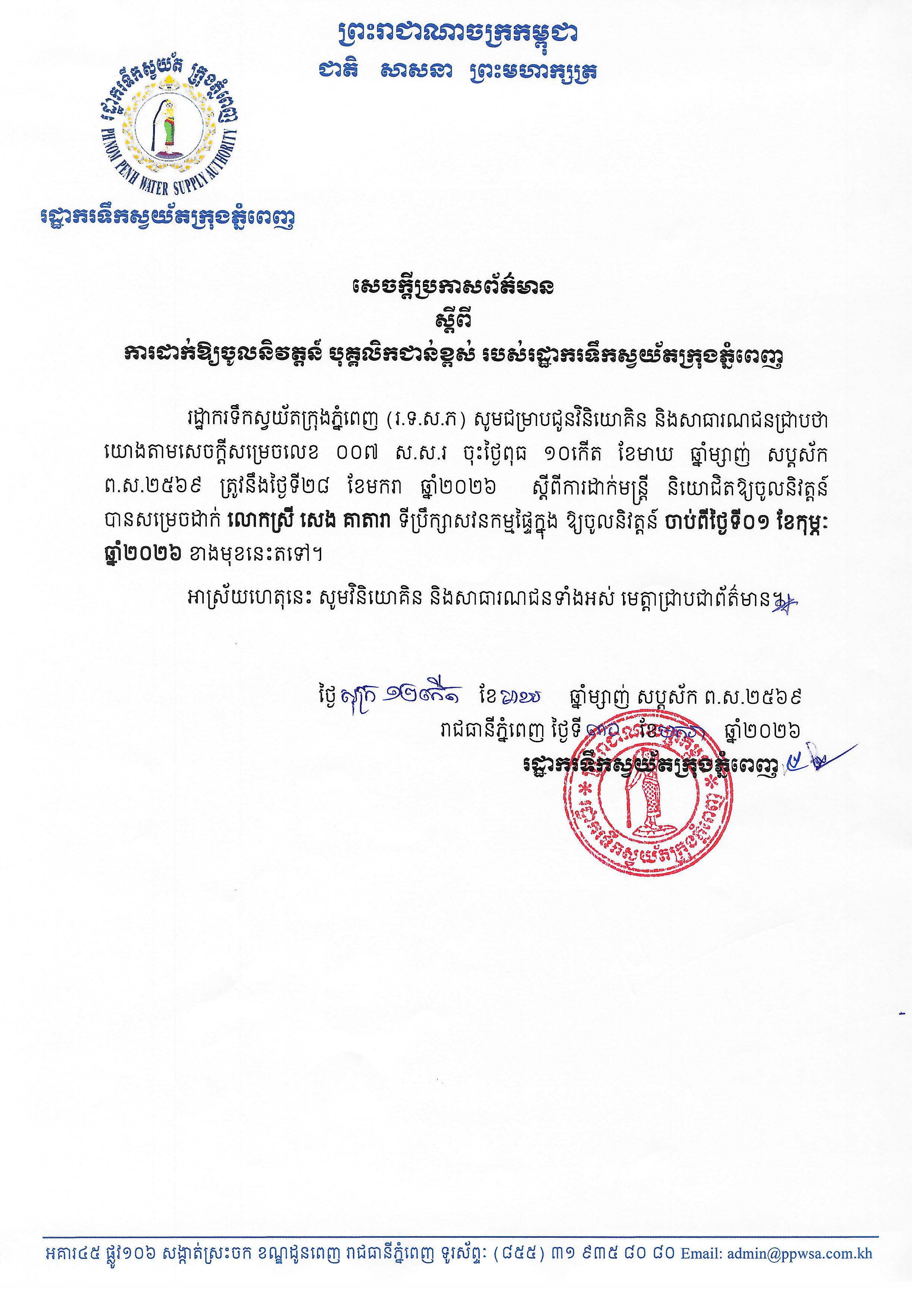 សេចក្តីប្រកាសព័ត៌មានស្តីពី ការដាក់ឱ្យចូលនិវត្តន៍ បុគ្គលិកជាន់ខ្ពស់ របស់រដ្ឋាករទឹកស្វយ័តក្រុងភ្នំពេញ