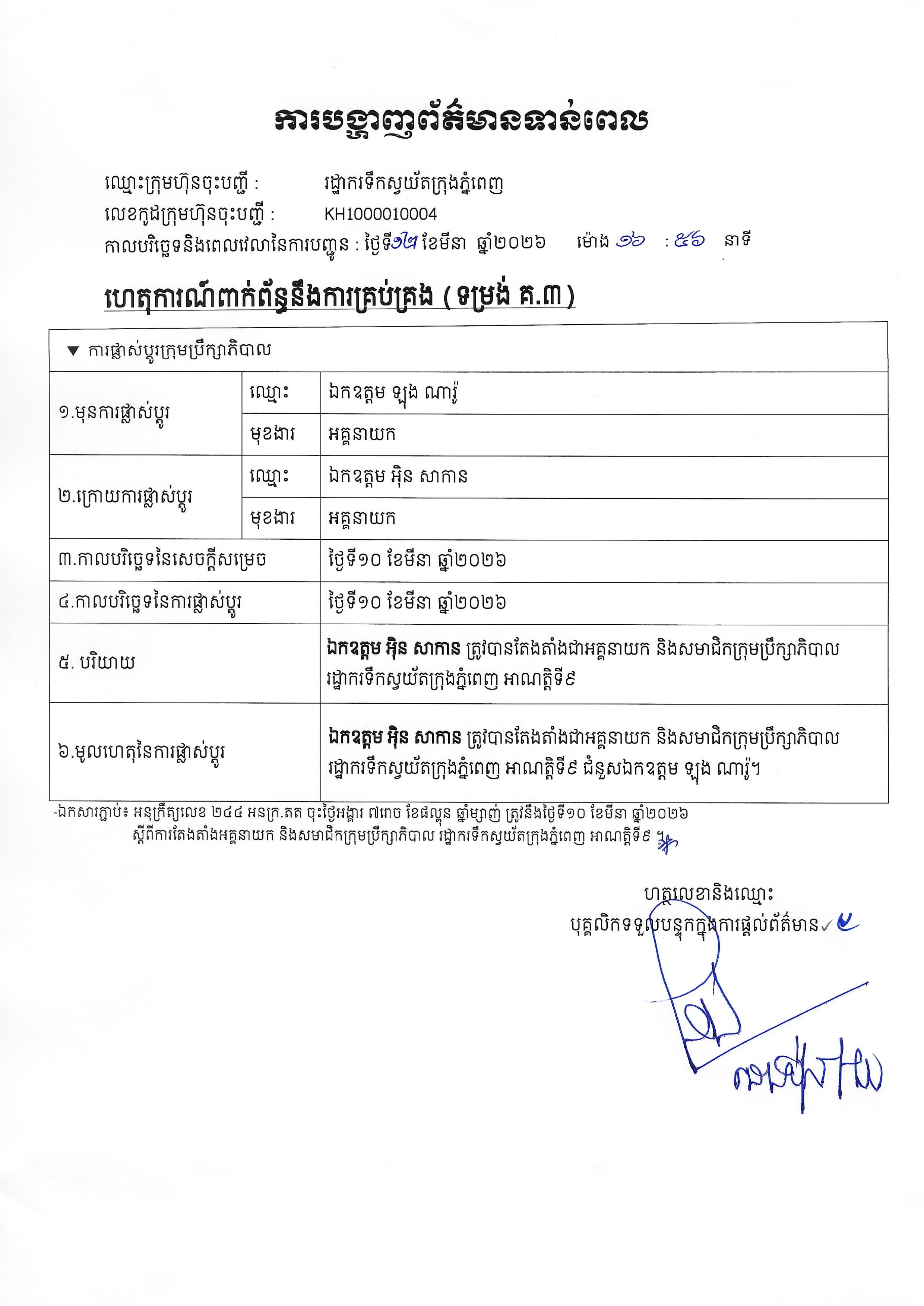 ការផ្លាស់ប្តូរក្រុមប្រឹក្សាភិបាលរដ្ឋាករទឹកស្វយ័តក្រុងភ្នំពេញ