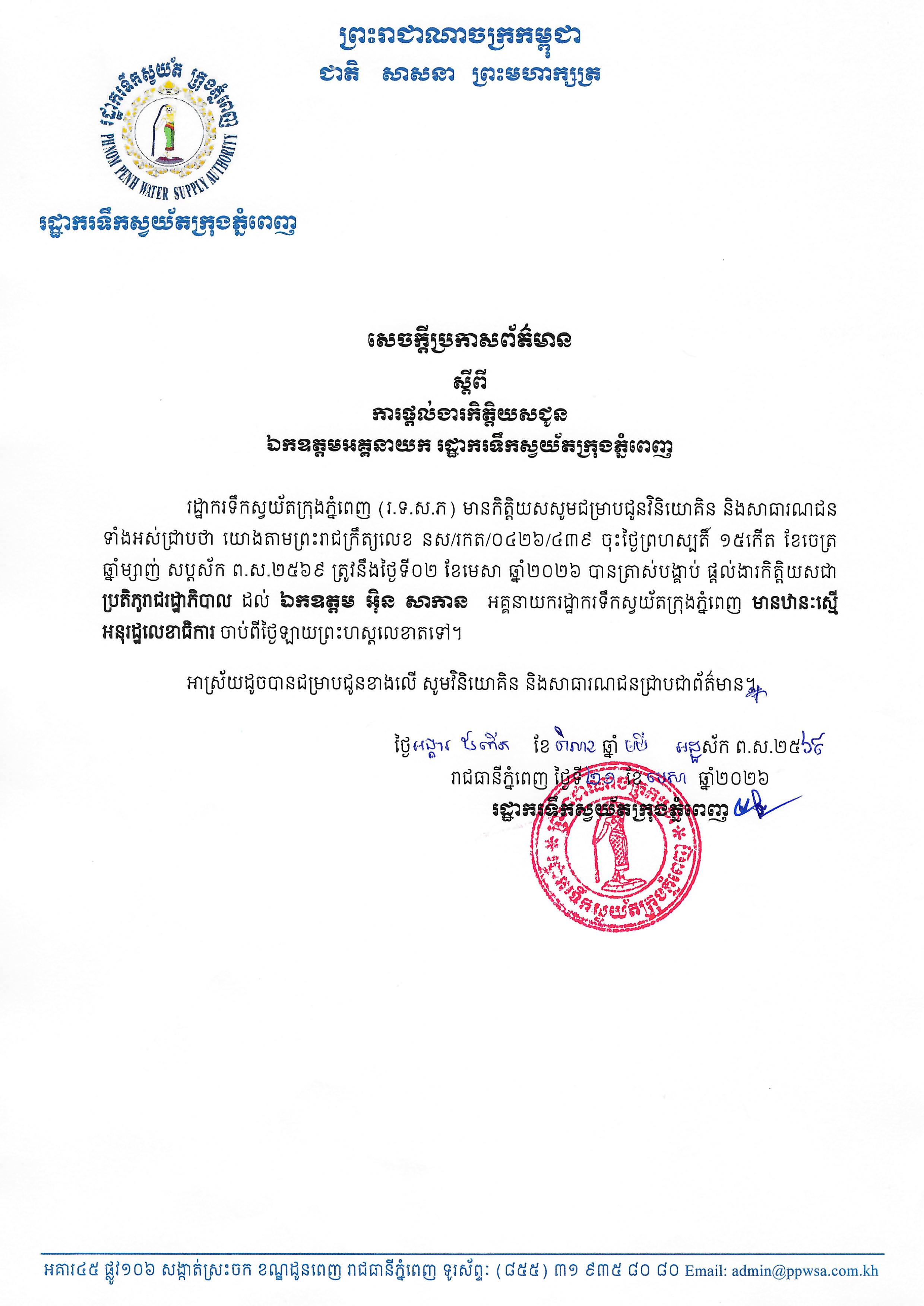 រដ្ឋាករទឹកស្វយ័តក្រុងភ្នំពេញ (រ.ទ.ស.ភ) មានកិត្តិយសសូមជម្រាបជូនវិនិយោគិន និងសាធារណជនទាំងអស់ជ្រាបថា យោងតាមព្រះរាជក្រឹត្យលេខ នស/រកត/០៤២៦/៤៣៩ ចុះថ្ងៃព្រហស្បតិ៍ ១៥កើត ខែចេត្រ ឆ្នាំម្សាញ់ សប្តស័ក ព.ស.២៥៦៩ ត្រូវនឹងថ្ងៃទី០២ ខែមេសា ឆ្នាំ២០២៦ បានត្រាស់បង្គាប់ ផ្តល់ងារកិត្តិយសជា ប្រតិភូរាជរដ្ឋាភិបាល ដល់ ឯកឧត្តម អ៊ិន សាកាន អគ្គនាយករដ្ឋាករទឹកស្វយ័តក្រុងភ្នំពេញ មានឋានៈស្មើ អនុរដ្ឋលេខាធិការ ចាប់ពីថ្ងៃឡាយព្រះហស្តលេខាតទៅ។